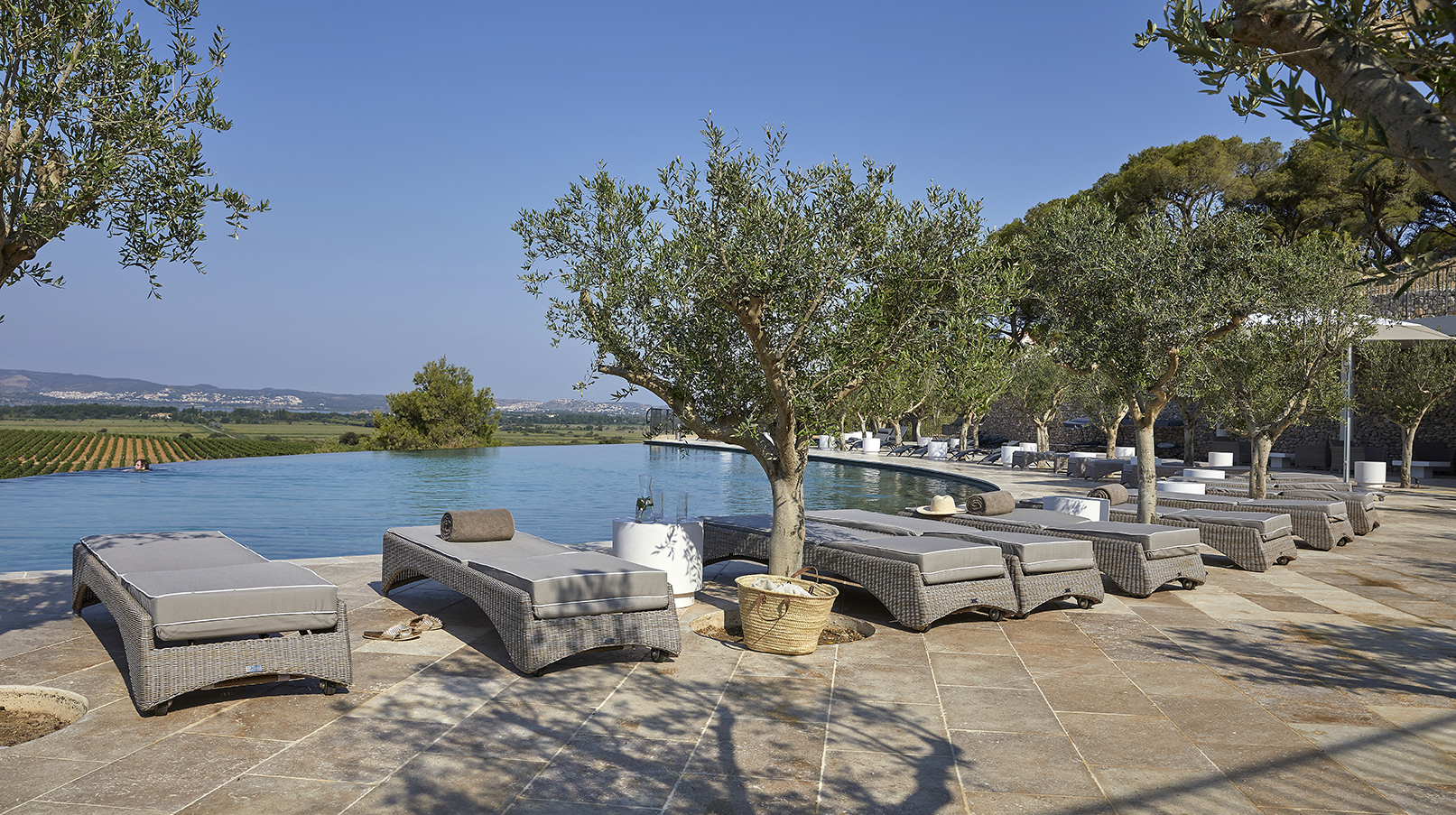 - Piscina de borde infinito rodeada de olivos: Experimenta la alegría de nadar en esta piscina con vistas a los viñedos y la laguna.